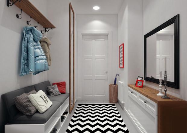 Однотонные поверхности зрительно расширяют площадь прихожей и дают сосредоточиться на ярких цветовых пятнах в виде ковра, банкетки, кресла. |