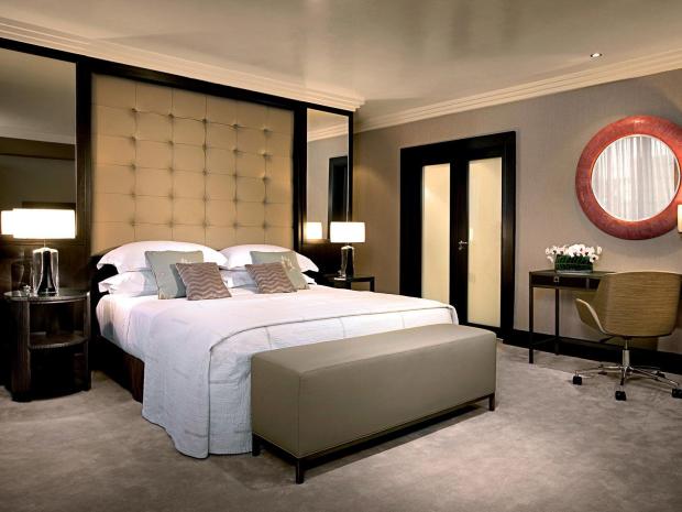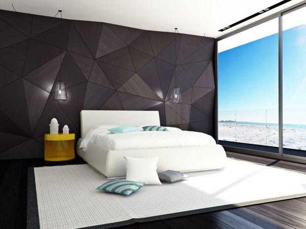 Приемы для оформления зоны изголовья – рельефные панно, кожаная стегая панель, подсвеченная ниша с жалюзи. Приставленные к стене напольные зеркала добавят помещению объема. |