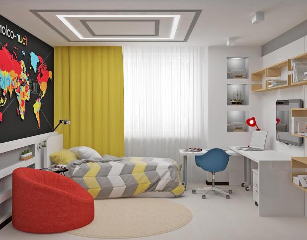 Роль украшений возьмет на себя текстиль – разнообразные по палитре и принтам шторы, покрывала, подушки. На стены можно развесить постеры, фотографии, географические карты, обучающие рисунки. Важно отказаться от слишком банальных "детских" предметов интерьера и развивать эстетический вкус у ребенка уже с юного возраста. |