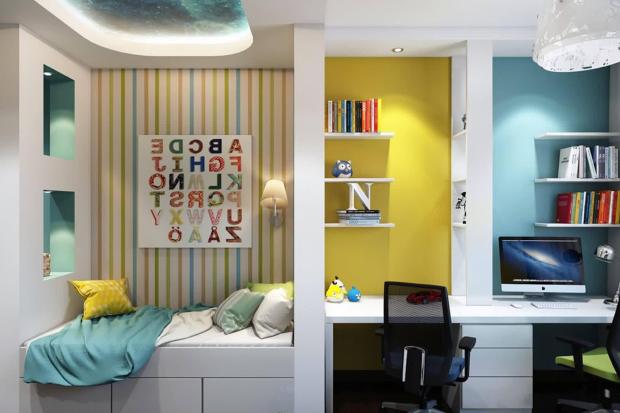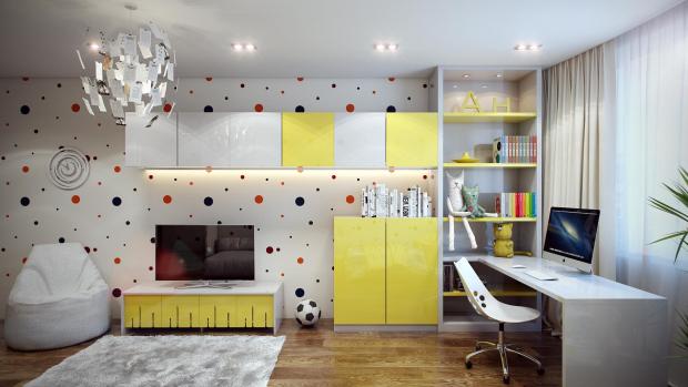 Обязательно многоуровневое освещение: в активное время суток будет доступна любая зона комнаты (рабочая, игровая), перед сном понадобится мягкий расслабляющий свет. С задачей справятся центральная люстра, точечные источники по периметру, настольные лампы, бра в зоне кровати. |