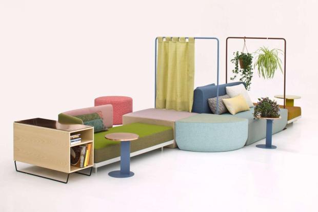 Это не просто диван, а целый блок из столиков, вешалки, полочек, рабочих поверхностей, ящиков для хранения. Комбинировать части можно самостоятельно, на свой вкус. Цветовая палитра – тоже на выбор. Такой диван не обязательно ставить у стены, как принято: он может занять любое место в комнате.