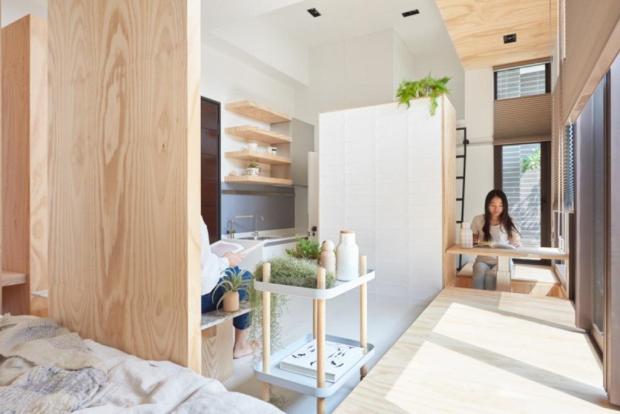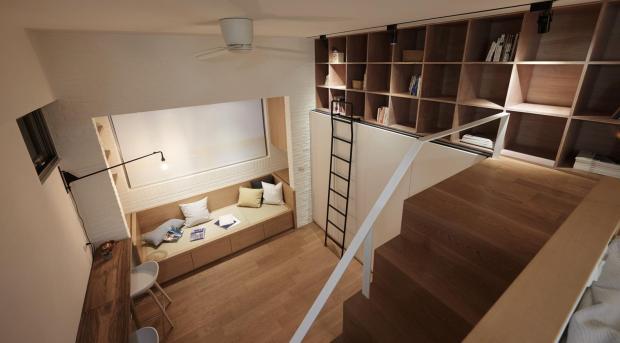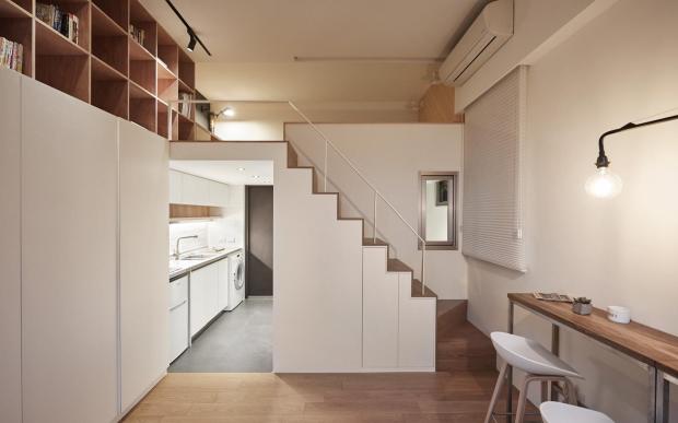 - Дизайн малогабаритной квартиры в Тайбэе площадью 22 кв. метра демонстрирует, как минимализм может удачно совместить функциональность и удобство. Спальное место вынесено на второй уровень, пространство под ним занимают зона кухни и санузел. Вдоль стен организованы рабочее место и система хранения.