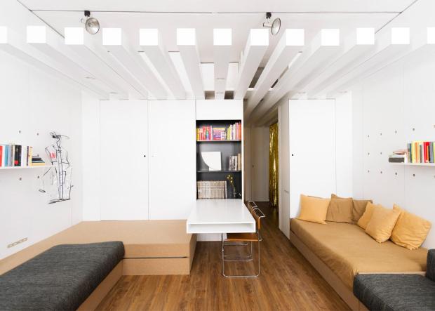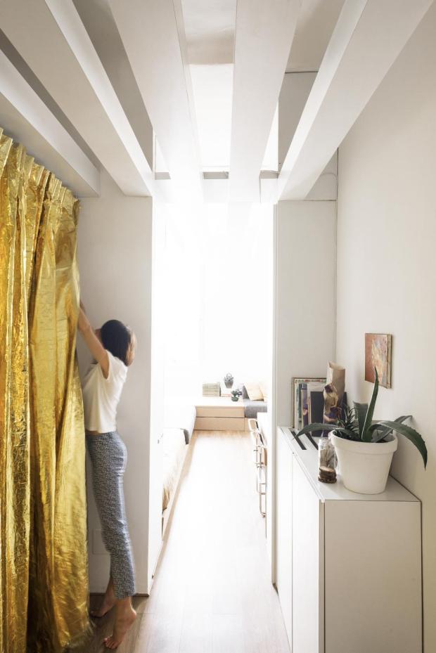 - Ниже проект флорентийского дизайнера Сильвии Аллори, в котором она преобразила свою 42-метровую квартиру. Пространство легко трансформируется, образуя рабочую зону и место отдыха. Со стены опускается панель, которая используется как письменный стол и открывает доступ к стеллажу. Расставленные по бокам диваны раскладываются и превращаются в спальные места. Яркий штрих для аскетичного интерьера квартиры – золотистая штора в гардеробной зоне, выполненная из блестящего изотермического спасательного одеяла.