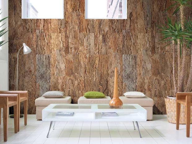 Стеновые панели неоднородного состава с орехово-коричневой гаммой выполняют не просто эстетическую функцию. Это прекрасная звукоизоляция для комнаты. В дизайне мебели пробку применяют для кофейных столиков.