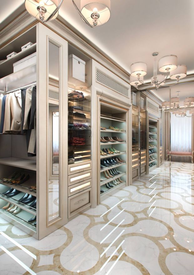 Приток естественных солнечных лучей из окон тоже немаловажен. А если в гардеробной располагается туалетный столик, освещение в интерьере помещения гардеробной предполагает и его локальную поддержку. Некоторые производители шкафов для гардероба и стоек дополнительно комплектуют подсветкой каждую секцию.