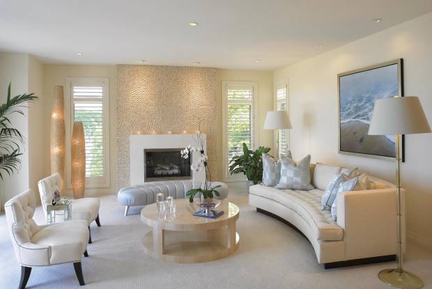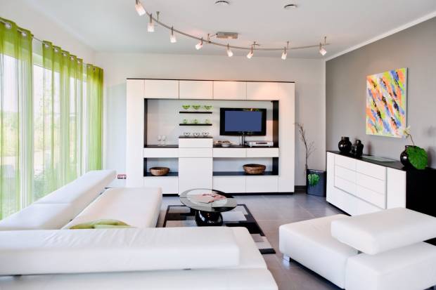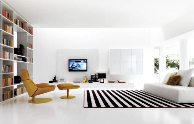 Дизайн гостиной в современном стиле этого направления отличается пристрастием к белому цвету. Комнату оформляют по принципу "лаунжа" или "чилл-аута" — пространство для приема больших компаний с разнообразием диванов и просторным центром для организации фуршетов.
