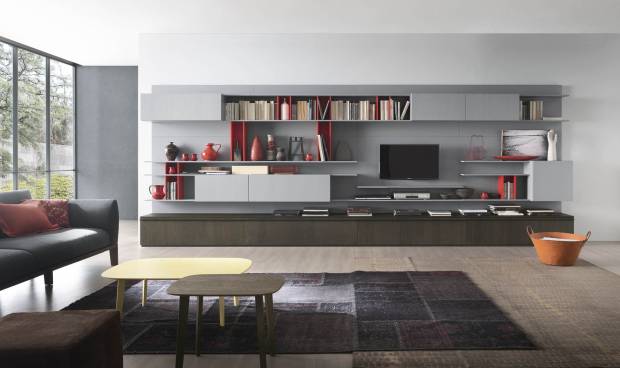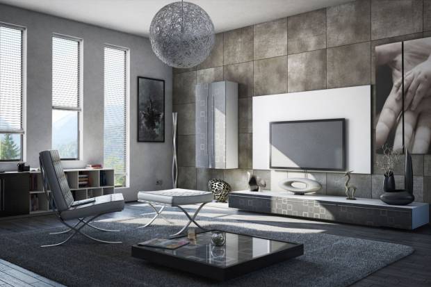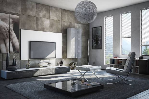 Металл в сочетании со стеклом и камень в союзе с деревом — самые излюбленные комбинации. В дизайне присутствуют открытые крепления элементов, эргономичные формы диванов и футуристичные светильники. Вместо традиционных шкафов – технологичные стеллажи и полки.