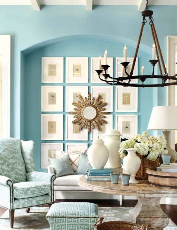Кроме белого цвета, здесь очень логично добавление зеленого и синего. Первого — в виде комнатных растений, предпочтительно экзотических крупномеров. Второго — для необходимого контраста с белым, например, в обивке мягкой мебели.