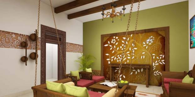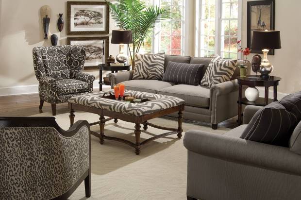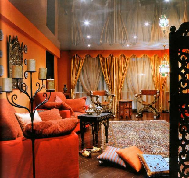 Мебель в современном интерьере гостиной предпочтительна простых форм, близких к минимализму. Именно на таком контрасте лучше всего будут играть этнические детали.