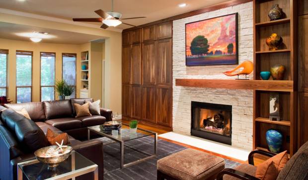 Цветовая гамма такой облицовки выбирают нейтральных оттенков. За счет сильной энергетики крупной текстуры современная гостиная будет производить впечатление масштабности.