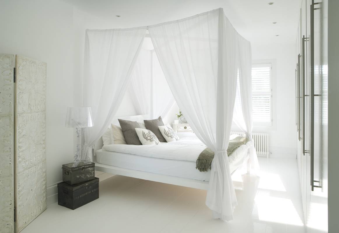 Это хороший выбор для тех, кто решил сделать спальню в двух цветах. Белый в спальне особенно удачно комбинируется с голубым, серым и пастельной гаммой.