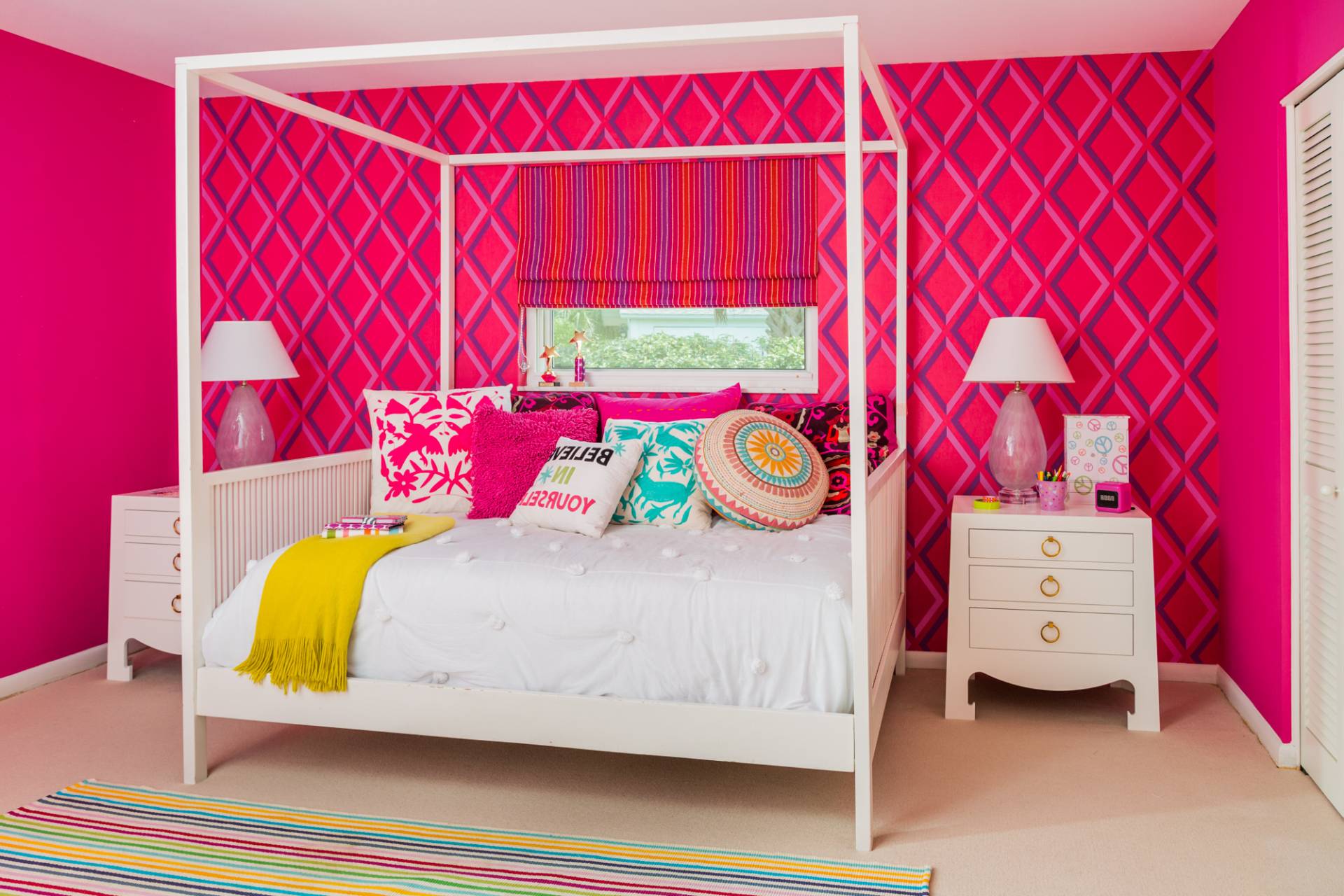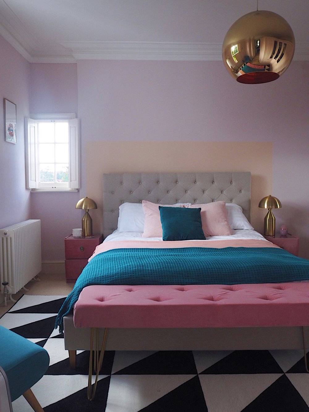Удачные комбинации для спальни: розовый, белый, голубой, бежевый, фиолетовый.