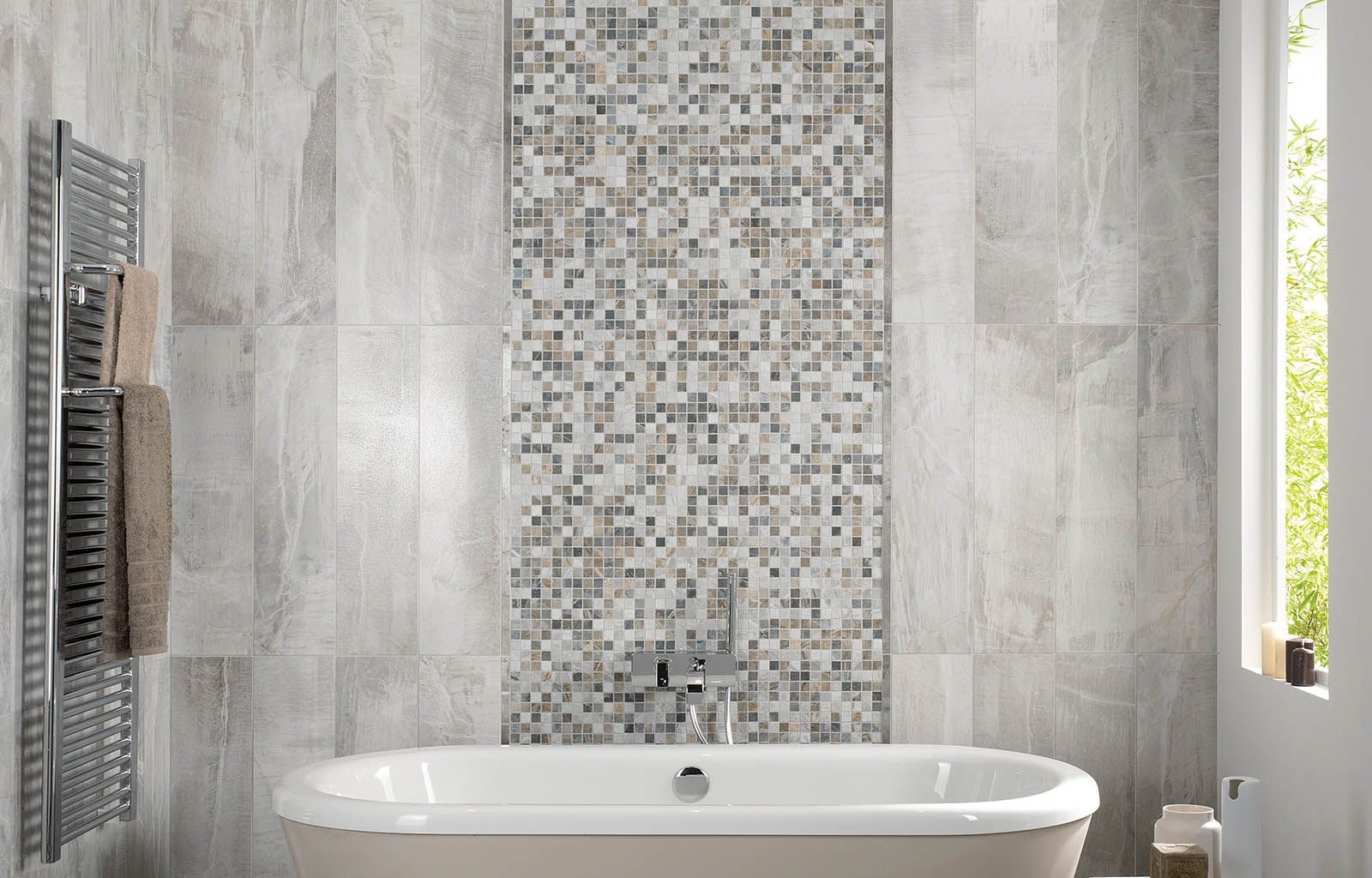 Добавить каплю цвета можно при помощи мозаичного фартука, выделив им зону ванны или раковины.