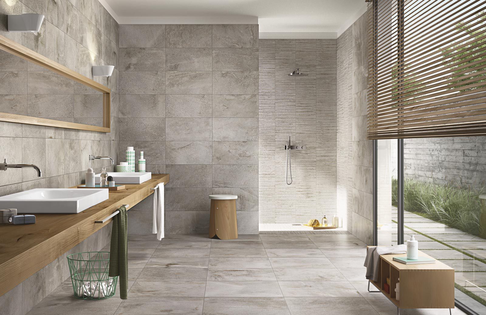 Это могут быть деревянные панели или навесные шкафчики, стены, имитирующие бетон и кирпичную кладку, напольная плитка, повторяющая фактуру камня, керамические аксессуары, горшечные растения, которым по душе влажность и отсутствие дневного света (например, папоротник).