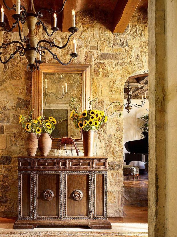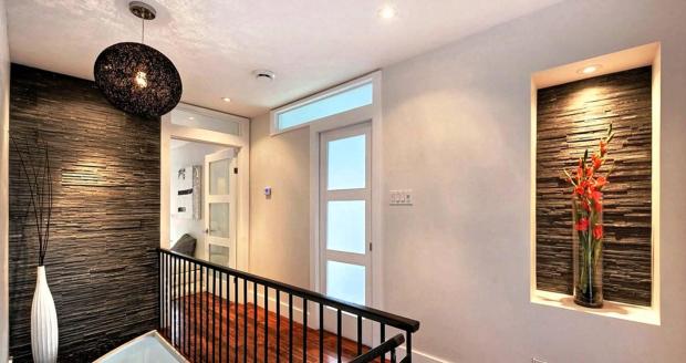 - Отделка холла декоративным камнем может подчеркнуть отдельный предмет декора или мебели, дверные проемы, окна, ниши.