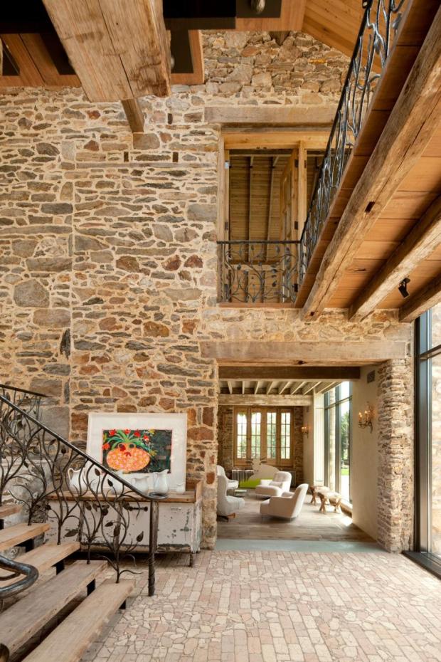 При оформлении прихожей декоративным камнем в стилистике кантри стоит обратить внимание на имитацию булыжника, песчаника, бута.