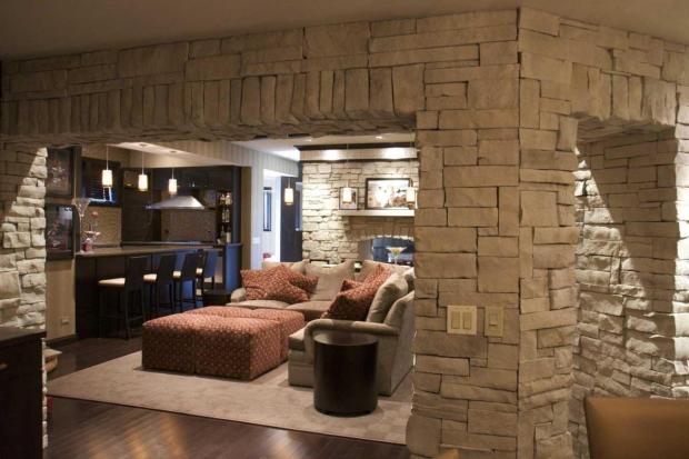 Ввиду большого выбора фактур и текстур искусственный камень можно использовать для фрагментарной облицовки – подчеркнуть выступы, ниши, камин, оформить панно.