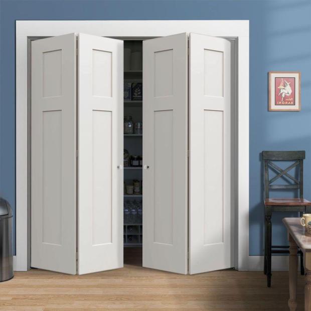 Оба полотна могут иметь равную ширину или быть асимметричными, за счет чего выдающаяся в комнату створка занимает меньше места. По сравнению с распашными моделями складной "книжке" нужно в 3 раза меньше свободной площади, чтобы функционировать. Еще один плюс этого варианта: к широкому дверному проему можно вплотную поставить шкафы или комод.