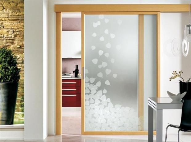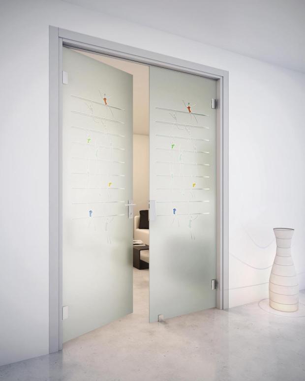 Из стекла изготавливают широкие раздвижные двойные и одинарные двери, а также сложные радиальные конструкции. Помимо светопрозрачности к достоинствам материала относят гигиеничность и водостойкость. Данную модель можно установить и на кухне.