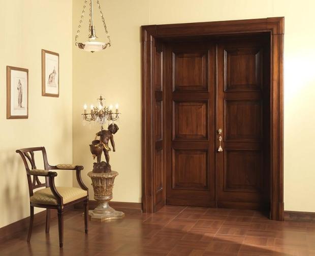 Модели из натуральной древесины – самые дорогие. Используют сосну, вишню, березу (это бюджетный вариант), дуб, орех, тик, ольху, бук (ценные породы). Межкомнатные двери для широких проемов в классе "премиум" изготавливают из эбенового, красного дерева, палисандра. Массив склеивают при высоком давлении, полотна получаются прочными и экологичными. Поверхность обрабатывают антисептиком и лаками для защиты от повреждений.