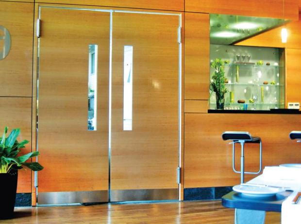 Распахиваются в обе стороны за счет особого строения коробки и установки возвратного механизма со специальными петлями. Уместны на границе часто посещаемых комнат. Для широкого проема выбирают двери с двумя створками.