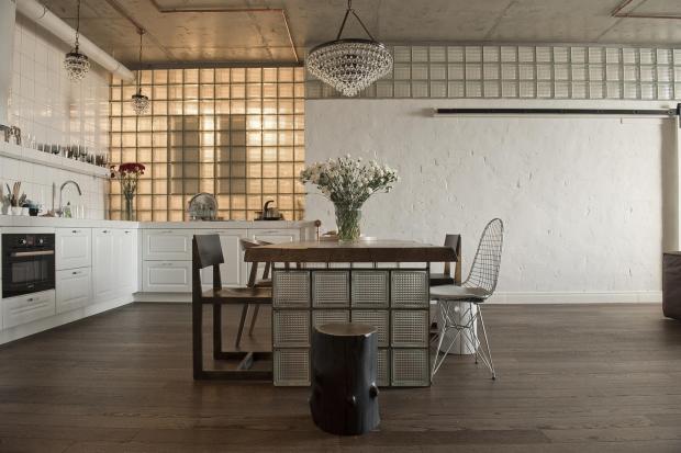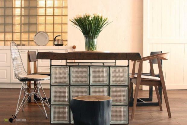 Интересно будет смотреться мебель из стеклоблоков. Материал очень прост в сборке, поэтому его можно использовать для фасада кухонного острова или как опору для журнального столика.