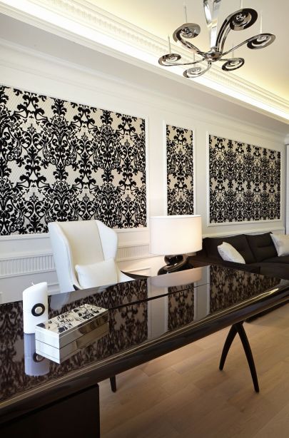 В отделке здесь также преобладает дерево, но его тона могут быть более светлыми, нейтральными. Уместны пастельные, теплые краски. Обивка мягкой мебели из кожи или бархата смотрится очень благородно, особенно с узнаваемой фирменной простежкой. Светильники (центральная люстра, бра, настольные лампы) соответствуют роскошной обстановке, как и канцелярские принадлежности на письменном столе.