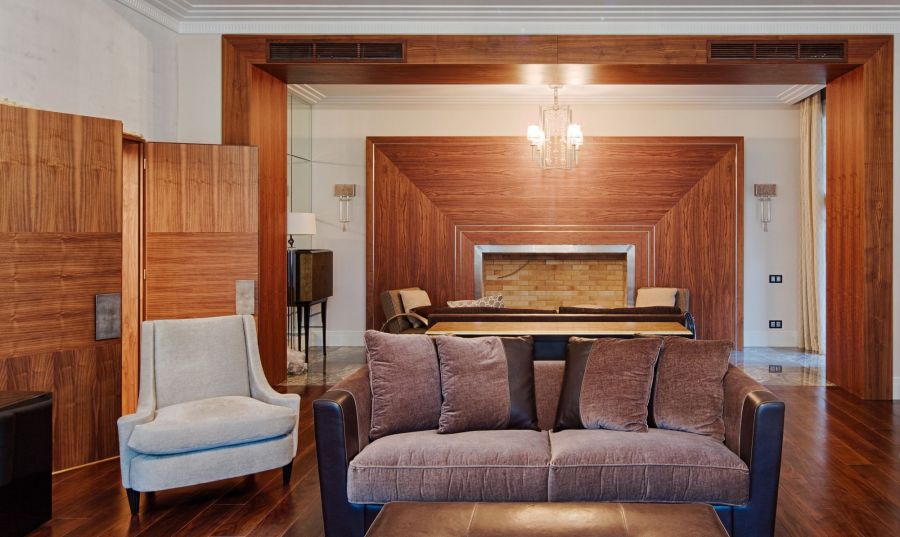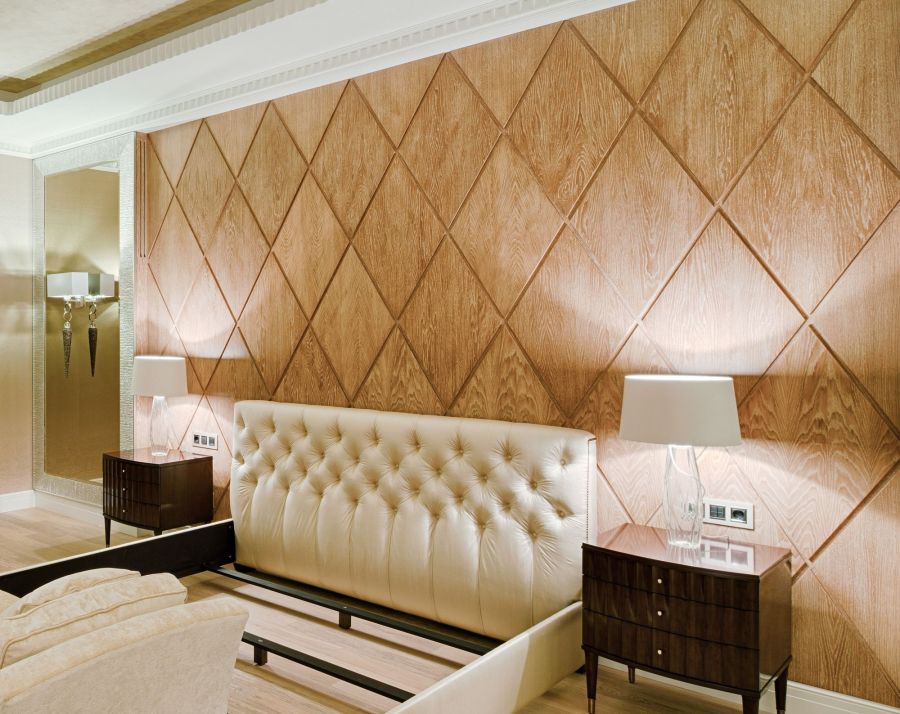 В проекте оформления загородного дома внутри активную роль играют фактура и цвет натурального дерева. Панелями из розового палисандра обшиты стены в гостиной, межкомнатные проемы, из этой же породы выполнена лестница и перила. Паркет золотисто-орехового оттенка украшает столовую и комнату отдыха. В спальне рельефными панелями в виде ромбов выделена стена за изголовьем кровати.