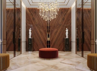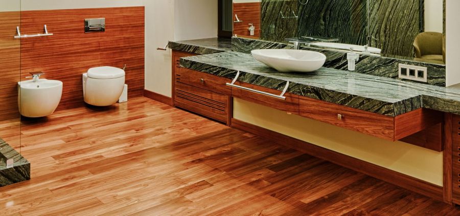 Подчеркнутая текстура и насыщенные тона дерева красиво сочетаются с фоновой светлой отделкой слоновой кости. В одном из санузлов палисандр комбинируется с таким же полосатым серо-зеленым мрамором.