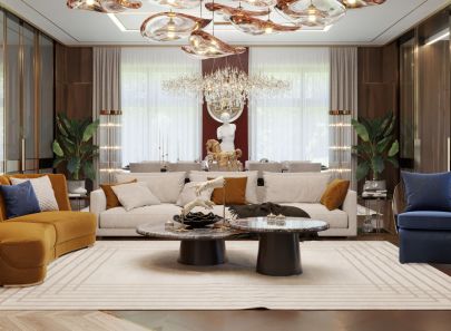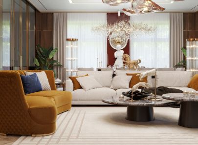 Округлые очертания диванов и кресел дополняет обивка с бархатистой фактурой и насыщенными цветами – горчичным, глубоким синим, изумрудным. Это безошибочно работает на создание уютной обстановки, где цветовая гамма яркая, но в то же время умиротворяющая.