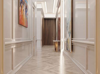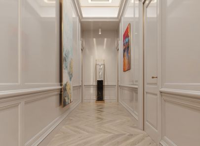 - светло-бежевый мрамор прихожей зрительно перетекает в такой же по тональности паркет холла и гостиной;