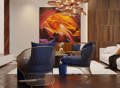 В реализованном проекте красивого ремонта в частном доме этот прием органично фокусирует жилое пространство вокруг зоны отдыха, очерчивая контуры с помощью деревянной балюстрады на первом и втором этажах. Каскадная люстра направляет внимание на ярко-синюю диванную группу и футуристический журнальный столик.