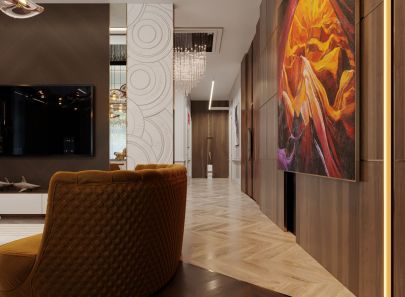 Акцент в отделочных материалах сделан на дерево и связанные с ним натуральные коричневые оттенки. Деревянными панелями обшиты стены, межкомнатные двери, фасады шкафов, ограждение лестницы. Темные цвета красиво комбинируются с белыми поверхностями и красочными арт-полотнами.