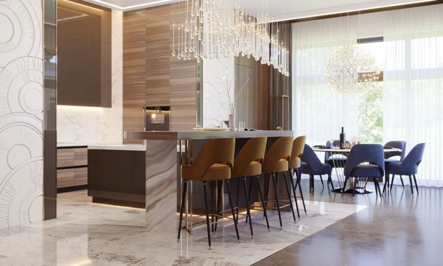 Планировка кухонной зоны интересна использованием ниши, куда встроены гарнитур и часть рабочих поверхностей. Остров, совмещенный с барной стойкой, вынесен в центр помещения и выделен на полу белой мраморной плиткой. Самостоятельная обеденная группа с круглым столом располагается у окна, откуда можно любоваться природой.