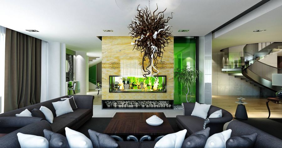 В концепции современного дизайна коттеджа большую гостиную отделяет от столовой перегородка с двусторонним камином и акцентным полупрозрачным зеленым стеклом.