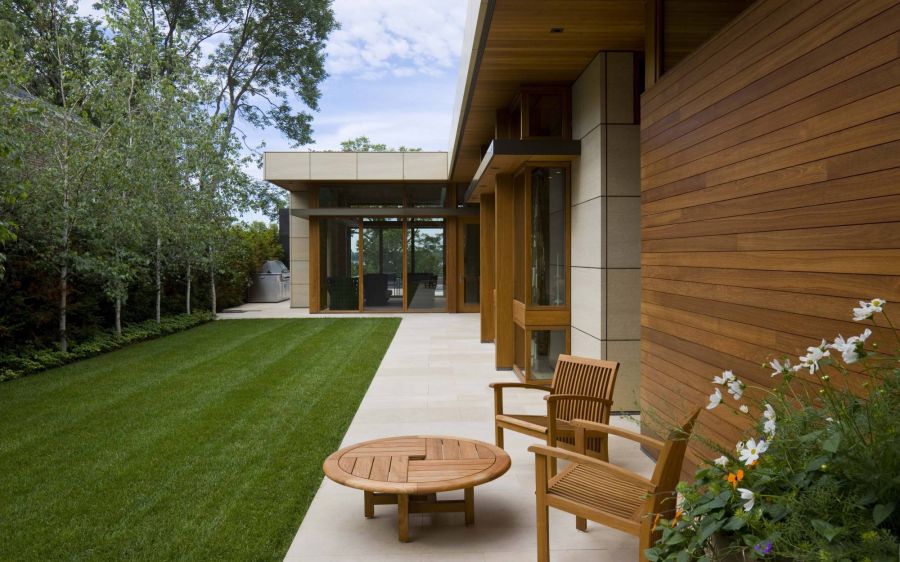 Не последнюю роль играет грамотное решение экстерьера, созвучное оформлению комнат. Как в проекте дизайна частного дома, где уличная терраса органично дополняет открытые внутренние пространства, обрамленные панорамными окнами и раздвижными перегородками.