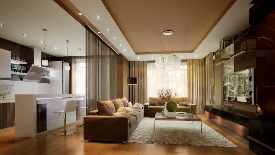 В проекте интерьера таунхауса объединяются прихожая, гостиная и кухня. Темные коричневые оттенки в отделке стен и мебели связывают пространство, а вот декоративная штора-перегородка ненавязчиво отделяет место отдыха от кухни.