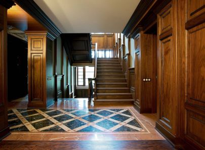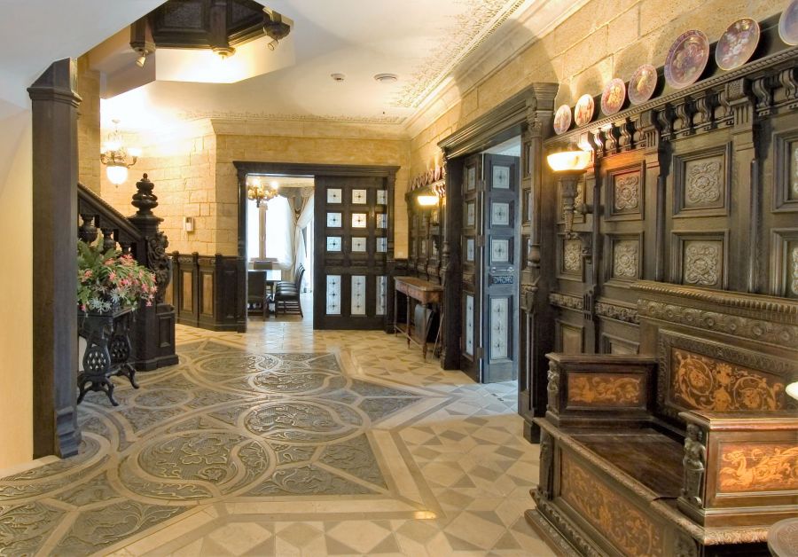 Комбинация природных материалов отличает дорогой ремонт и становится основой для выразительных декоративных решений. В проекте превосходных интерьеров сочетание каменной кладки, мрамора, темного резного дерева, кованого металла позволили превратить современную загородную виллу в стилизованный европейский замок с атмосферой очаровательной старины.