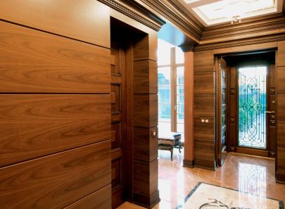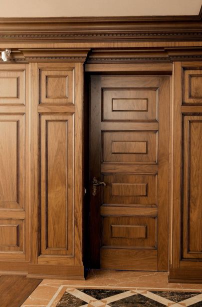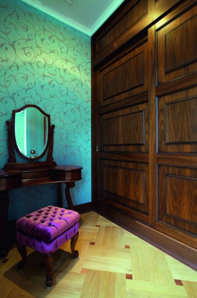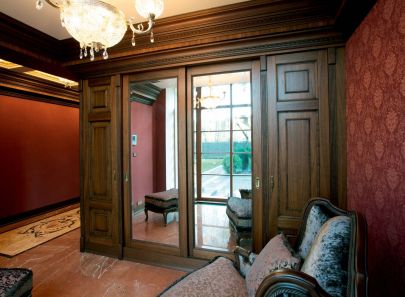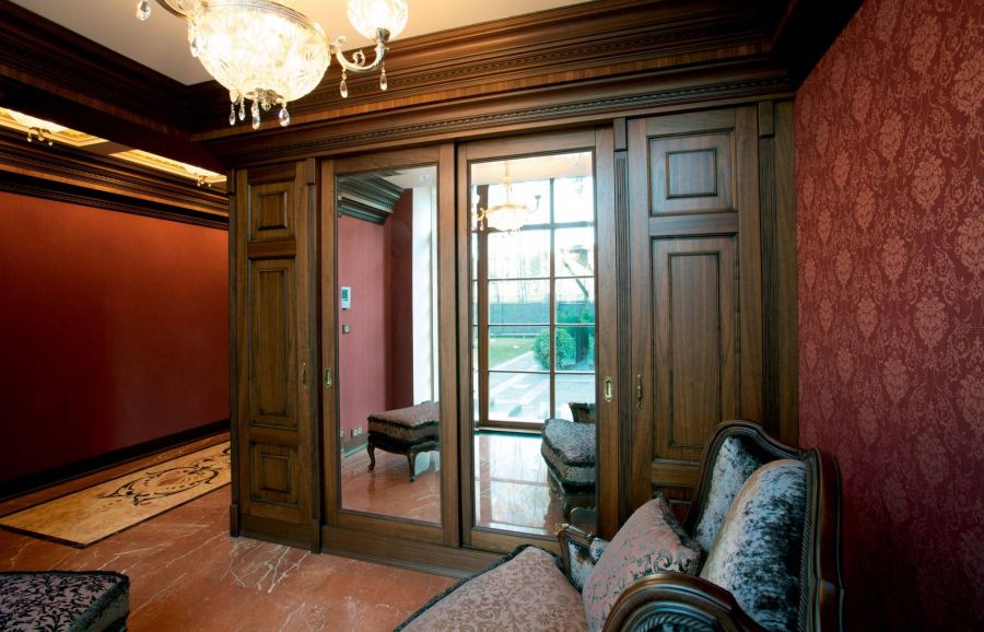- Великолепные буазери с филенками насыщают стены классическим рельефом. Темную каштановую гамму поддерживает мебель из массива дуба, в частности шкаф с зеркалами в прихожей.