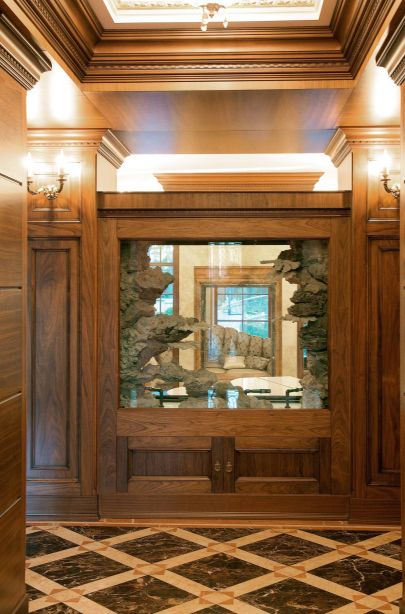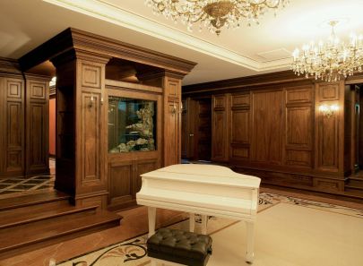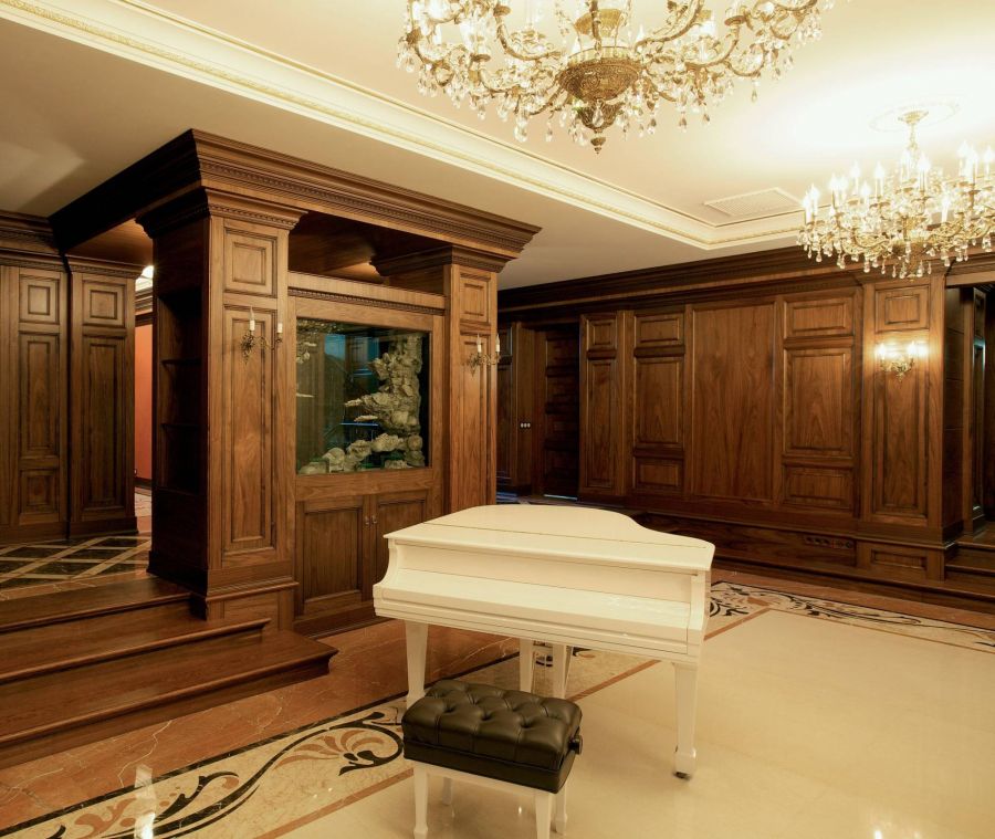 Для загородного особняка авторы "ТопДом" разработали представительный интерьер в классическом направлении. Ведущими финишными покрытиями стали дерево насыщенных коричневых оттенков и мрамор терракотовых, бежевых и темно-серых тонов. Организация парадной части включает прихожую с зоной отдыха и панорамным остеклением, холл с проходом к межэтажной лестнице, в столовую и гостиную. Комната для приема гостей расположена чуть ниже основного уровня, что позволило спроектировать на границе с коридором красивую перегородку с декоративным панно и боковые ступени. В цокольном этаже разместились домашний кинотеатр и кальянная комната.