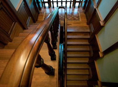 - Комбинирование дерева и обоев – каноническое для стиля, за счет подобранного оттенка можно регулировать "температуру" строгого интерьера. Так в прихожей стены оклеены обоями теплого кораллового цвета, который гармонично сочетается с сиреневой диванной группой; зону лестницы осветляют обои прохладного светло-оливкового тона.