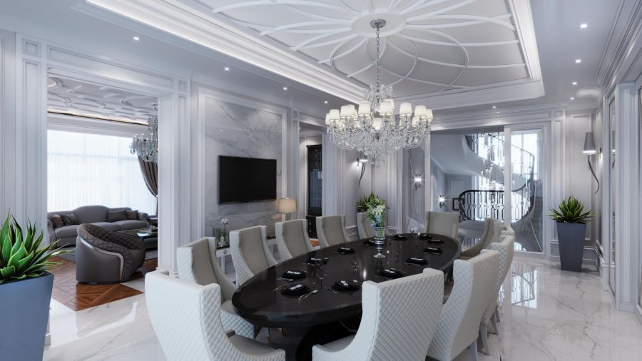 В проекте дизайна частного дома в классическом стиле потолки в гостиной, столовой и на кухне украшены объемными геометрическими рисунками – они подчеркивают современную составляющую обстановки.