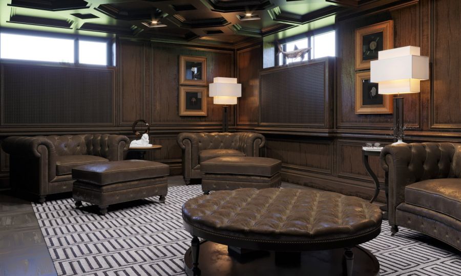 Пример оформления в насыщенных темно-коричневых цветах – отделка сигарной комнаты. Элегантный английский стиль предпочитает натуральное дерево, кожу и атмосферу клуба для джентльменов.