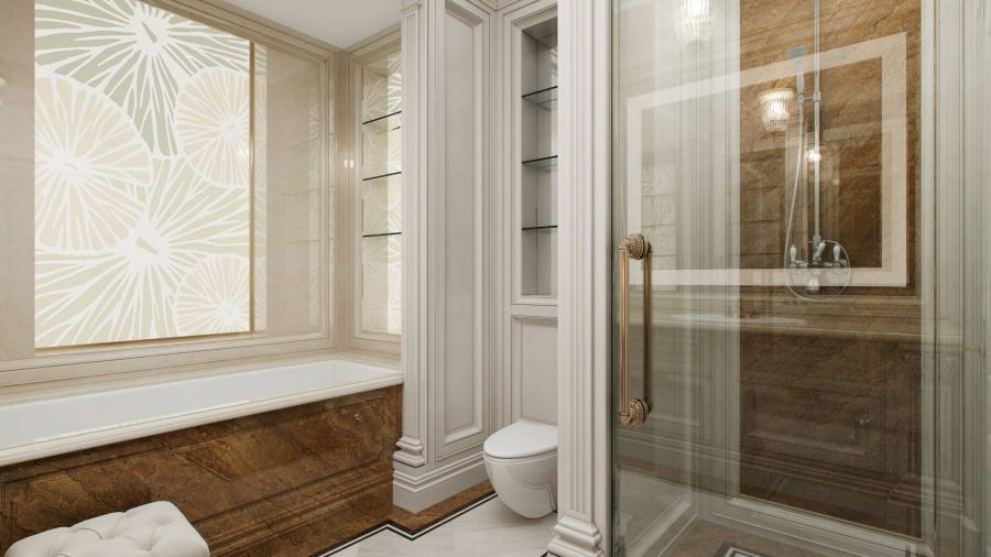 - на кухне и в ванной комнате серый и коричневый мрамор расставляют акценты.