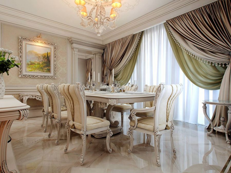 В зависимости от стилизации оформление потолка может быть выполнено с лепниной, росписью, резьбой, витражами, кессонами. В элитных интерьерах допускаются подвесные и натяжные конструкции. Белый цвет смотрится парадно и заодно увеличивает пространство.