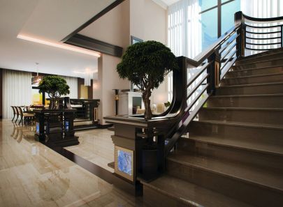 Полосой из темного дерева отделена также ступень на спуске в зону отдыха. По обеим сторонам проход обрамлен кашпо с декоративными деревьями. Каждое из кашпо помещено в центр деревянной конструкции с решетчатым ограждением, которое является продолжением с одной стороны лестницы, а с другой – перил на границе со столовой.