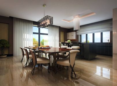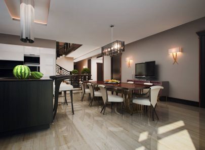 Столовая располагается слева от входной группы и хорошо просматривается из гостиной. В центре – обеденный стол с необычными подножьями в форме множества узких вертикальных планок. Место у окна занимает кухня с барной стойкой.