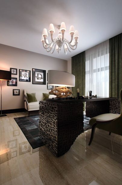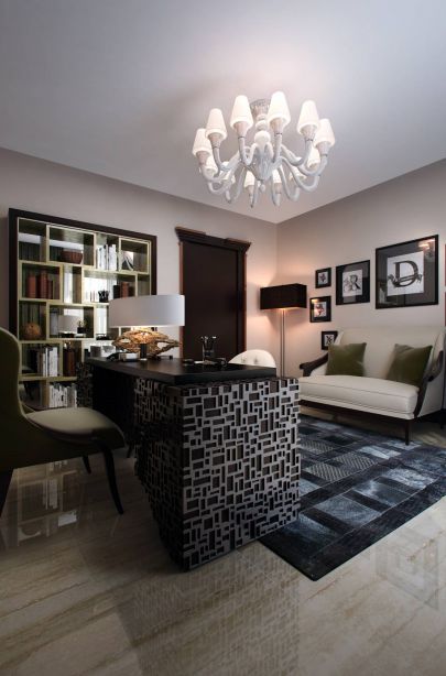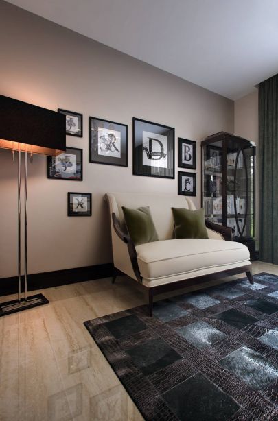 Интерьер кабинета также графичен, в качестве темных доминант выступают рабочий стол, напольный ковер стальных оттенков, книжный шкаф и паспарту настенных рисунков.