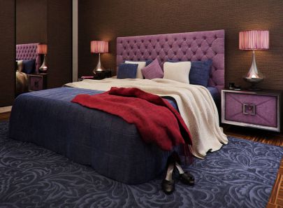 Украшения в виде квадратных панелей аметистовых оттенков на описанных конструкциях перекликаются с насыщенным фиолетовым цветом кресел в ТВ-зоне.