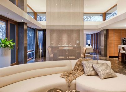 Все интерьеры в экостиле – гостиной, столовой и кухни – пространственно объединены. Белоснежные цвета межуровневых перекрытий, кухонных фасадов, мягкой мебели контрастируют с темно-пепельным оттенком стен, а также напольной крупноформатной плиткой с эффектом потертости.